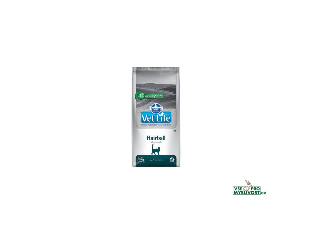 HairballFarmina Vet Life Hairball je kompletní krmivo pro dospělé kočky, které napomáhá snížit tvorbu trichobezoárů.