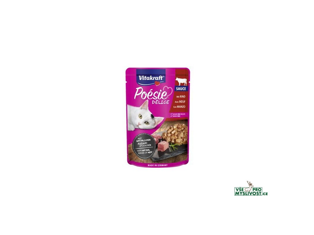 Poésie Délice Sauce s hovězím masem od značky Vitakraft – kompletní mokré krmivo pro dospělé jedince. Kapsička potěší vašeho mazlíčka, ať už je jakéhokoliv plemena či velikosti. Uvnitř nenajdete žádný cukr, ani obiloviny. Zato obsahuje poctivou porci kousků šťavnatého masa a minerálních látek. Díky lahodné omáčce zachutná každé kočce.