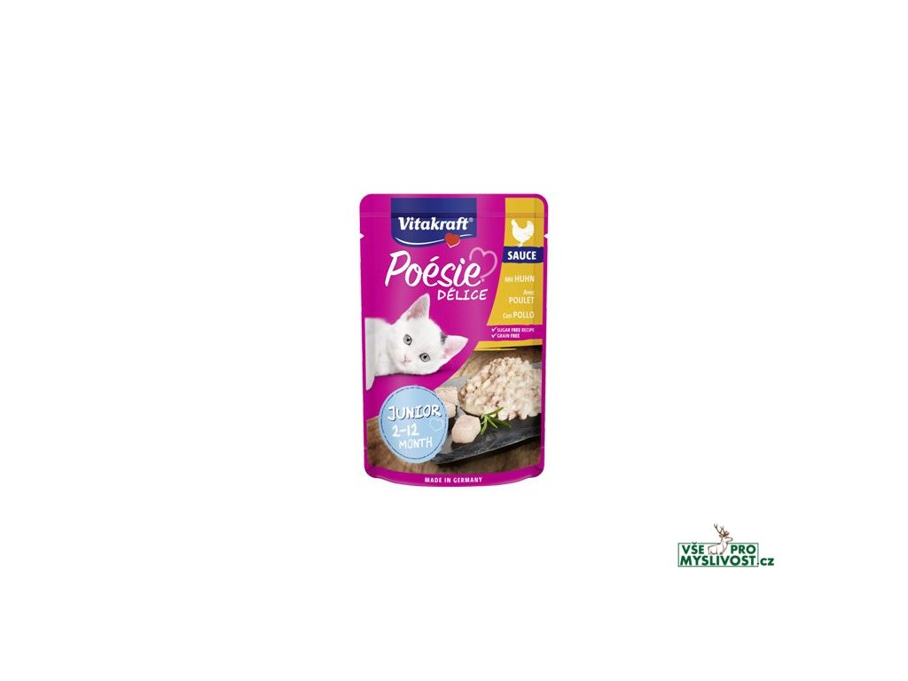 Poésie Délice Sauce Junior od značky Vitakraft – kompletní mokré krmivo pro koťata od 2 do 12 měsíců. Kapsička potěší vašeho mazlíčka, ať už je jakéhokoliv plemena. Uvnitř nenajdete žádný cukr, ani obiloviny. Zato obsahuje poctivou porci kousků šťavnatého masa a minerálních látek. Díky lahodné omáčce zachutná každému koťátku.