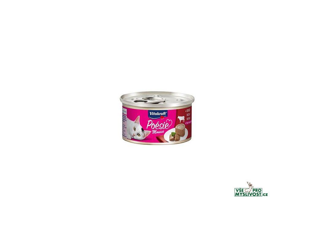 Poésie Mousse od značky Vitakraft – kompletní krmivo s hovězí příchutí pro dospělé jedince všech velikostí a plemen. Uvnitř konzervičky čeká paštika ve formě delikátní pěny, která zachutná každé kočce. Je vyrobená z masa a obsahuje minerální látky. Nenajdete v ní žádný cukr, umělá barviva, ani obiloviny. Dopřejte svému mazlíčkovi po dni plném dobrodružství to nejlepší!