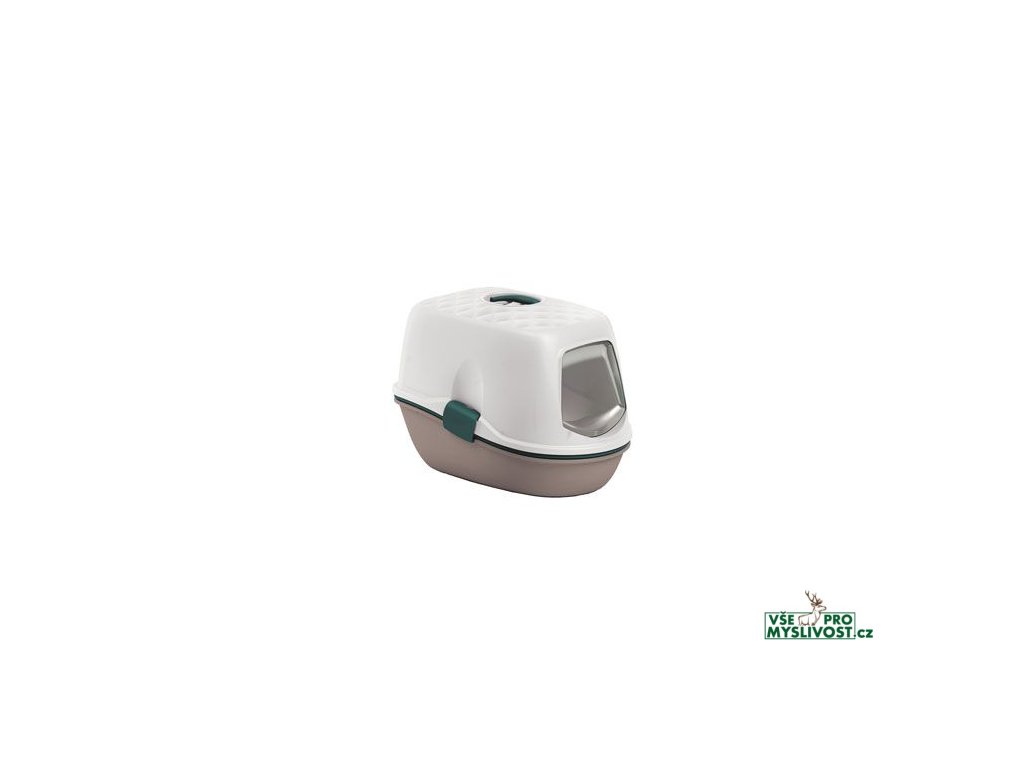 Inovativní a ekonomická krytá toaleta pro kočky. Toaleta se skládá z horního krytu s rukojetí a výklopnými dvířky a ze 2 podnosů a 1 vkládacího síta. Síto umožňuje oddělit nečistoty a opětovně použít čistou podestýlku (výměnou podnosů), čímž se zamezí jakémukoliv vysypávání steliva.