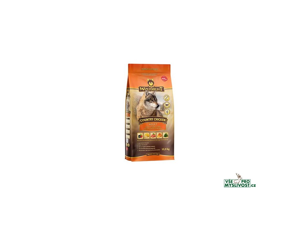 Vlci loví svou kořist od Skalistých hor Severní Ameriky, arktické tundry, hor a lesů Evropy až po pouště a stepi střední Asie. To jim dodává maso a vnitřnosti bohaté na živiny, ale také zeleninu, ovoce, bobule, kořeny a bylinky z obsahu žaludku kořisti. Obilí zde není zahrnuto. Vlk tak přijímá potřebné vitamíny, minerály, stopové prvky, enzymy a druhotné rostlinné látky. Vzhledem k tomu, že vlk je předkem všech psů, naše suché krmivo pro psy Wolfsblut je založeno na přirozených stravovacích návycích vlka. Obsahuje hodně masa nebo ryb v kombinaci se superpotravinami, které obsahují hodnotné ingredience – stejně jako v přírodě, bez obilovin. Náš výběr výjimečných druhů masa a superpotravin bohatých na živiny vychází z vlčích biotopů a jejich pestré stravy. Wolfsblut nabízí každému psovi druhově vhodnou a originální stravu a díky rozmanitosti odrůd si každý najde něco, co snese. Receptura suchého krmiva COUNTRY CHICKEN ADULT kombinuje výživu vlků s nejnovějšími vědeckými poznatky o správné výživě psů.