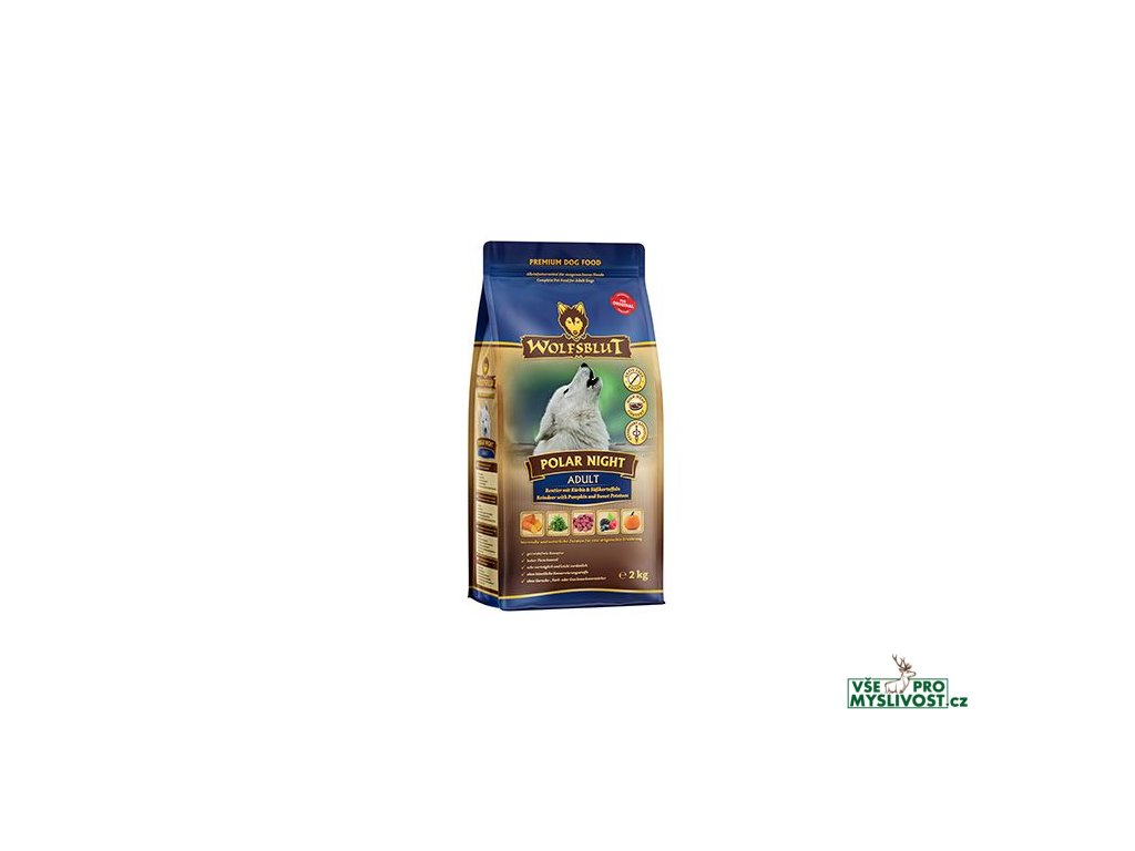 Vlci loví svou kořist od Skalistých hor Severní Ameriky, arktické tundry, hor a lesů Evropy až po pouště a stepi střední Asie. To jim dodává maso a vnitřnosti bohaté na živiny, ale také zeleninu, ovoce, bobule, kořeny a bylinky z obsahu žaludku kořisti. Obilí zde není zahrnuto. Vlk tak přijímá potřebné vitamíny, minerály, stopové prvky, enzymy a druhotné rostlinné látky. Vzhledem k tomu, že vlk je předkem všech psů, naše suché krmivo pro psy Wolfsblut je založeno na přirozených stravovacích návycích vlka. Obsahuje hodně masa nebo ryb v kombinaci se superpotravinami, které obsahují hodnotné ingredience – stejně jako v přírodě, bez obilovin. Náš výběr výjimečných druhů masa a superpotravin bohatých na živiny vychází z vlčích biotopů a jejich pestré stravy. Wolfsblut nabízí každému psovi druhově vhodnou a originální stravu a díky rozmanitosti odrůd si každý najde něco, co snese. Receptura suchého krmiva POLAR NIGHT ADULT kombinuje výživu vlků s nejnovějšími vědeckými poznatky o správné výživě psů.
