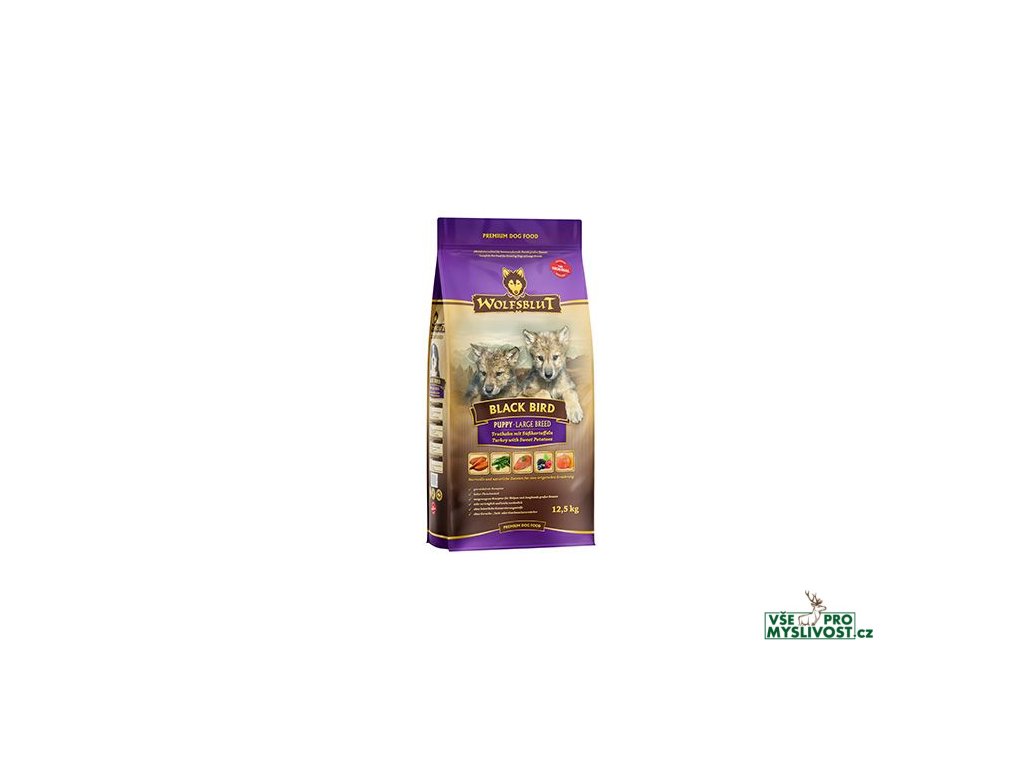 Vlci loví svou kořist od Skalistých hor Severní Ameriky, arktické tundry, hor a lesů Evropy až po pouště a stepi střední Asie. To jim dodává maso a vnitřnosti bohaté na živiny, ale také zeleninu, ovoce, bobule, kořeny a bylinky z obsahu žaludku kořisti. Obilí zde není zahrnuto. Vlk tak přijímá potřebné vitamíny, minerály, stopové prvky, enzymy a druhotné rostlinné látky. Vzhledem k tomu, že vlk je předkem všech psů, naše suché krmivo pro psy Wolfsblut je založeno na přirozených stravovacích návycích vlka. Obsahuje hodně masa nebo ryb v kombinaci se superpotravinami, které obsahují hodnotné ingredience – stejně jako v přírodě, bez obilovin. Náš výběr výjimečných druhů masa a superpotravin bohatých na živiny vychází z vlčích biotopů a jejich pestré stravy. Wolfsblut nabízí každému psovi druhově vhodnou a originální stravu a díky rozmanitosti odrůd si každý najde něco, co snese. Receptura suchého krmiva BLACK BIRD Puppy Large Breed kombinuje výživu vlků s nejnovějšími vědeckými poznatky o správné výživě psů.