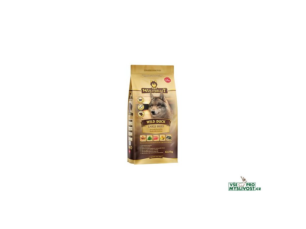 Vlci loví svou kořist od Skalistých hor Severní Ameriky, arktické tundry, hor a lesů Evropy až po pouště a stepi střední Asie. To jim dodává maso a vnitřnosti bohaté na živiny, ale také zeleninu, ovoce, bobule, kořeny a bylinky z obsahu žaludku kořisti. Obilí zde není zahrnuto. Vlk tak přijímá potřebné vitamíny, minerály, stopové prvky, enzymy a druhotné rostlinné látky. Vzhledem k tomu, že vlk je předkem všech psů, naše suché krmivo pro psy Wolfsblut je založeno na přirozených stravovacích návycích vlka. Obsahuje hodně masa nebo ryb v kombinaci se superpotravinami, které obsahují hodnotné ingredience – stejně jako v přírodě, bez obilovin. Náš výběr výjimečných druhů masa a superpotravin bohatých na živiny vychází z vlčích biotopů a jejich pestré stravy. Wolfsblut nabízí každému psovi druhově vhodnou a originální stravu a díky rozmanitosti odrůd si každý najde něco, co snese. Receptura suchého krmiva WILD DUCK LARGE BREED kombinuje výživu vlků s nejnovějšími vědeckými poznatky o správné výživě psů.