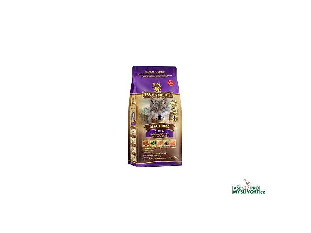Vlci loví svou kořist od Skalistých hor Severní Ameriky, arktické tundry, hor a lesů Evropy až po pouště a stepi střední Asie. To jim dodává maso a vnitřnosti bohaté na živiny, ale také zeleninu, ovoce, bobule, kořeny a bylinky z obsahu žaludku kořisti. Obilí zde není zahrnuto. Vlk tak přijímá potřebné vitamíny, minerály, stopové prvky, enzymy a druhotné rostlinné látky. Vzhledem k tomu, že vlk je předkem všech psů, naše suché krmivo pro psy Wolfsblut je založeno na přirozených stravovacích návycích vlka. Obsahuje hodně masa nebo ryb v kombinaci se superpotravinami, které obsahují hodnotné ingredience – stejně jako v přírodě, bez obilovin. Náš výběr výjimečných druhů masa a superpotravin bohatých na živiny vychází z vlčích biotopů a jejich pestré stravy. Wolfsblut nabízí každému psovi druhově vhodnou a originální stravu a díky rozmanitosti odrůd si každý najde něco, co snese. Receptura na suché krmivo BLACK BIRD SENIOR kombinuje výživu vlků s nejnovějšími vědeckými poznatky o správné výživě psů.
