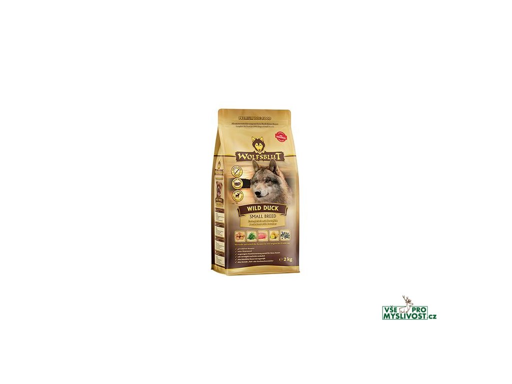 Vlci loví svou kořist od Skalistých hor Severní Ameriky, arktické tundry, hor a lesů Evropy až po pouště a stepi střední Asie. To jim dodává maso a vnitřnosti bohaté na živiny, ale také zeleninu, ovoce, bobule, kořeny a bylinky z obsahu žaludku kořisti. Obilí zde není zahrnuto. Vlk tak přijímá potřebné vitamíny, minerály, stopové prvky, enzymy a druhotné rostlinné látky. Vzhledem k tomu, že vlk je předkem všech psů, naše suché krmivo pro psy Wolfsblut je založeno na přirozených stravovacích návycích vlka. Obsahuje hodně masa nebo ryb v kombinaci se superpotravinami, které obsahují hodnotné ingredience – stejně jako v přírodě, bez obilovin. Náš výběr výjimečných druhů masa a superpotravin bohatých na živiny vychází z vlčích biotopů a jejich pestré stravy. Wolfsblut nabízí každému psovi druhově vhodnou a originální stravu a díky rozmanitosti odrůd si každý najde něco, co snese. Receptura na suché krmivo WILD DUCK SMALL BREED kombinuje výživu vlků s nejnovějšími vědeckými poznatky o správné výživě psů.