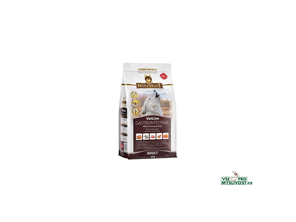 WOLFSBLUT VetLine GASTROINTESTINAL je kompletní dietní krmivo pro dospělé psy ke zmírnění poruch vstřebávání střev a ke kompenzaci nedostatečného trávení a chronické pankreatické nedostatečnosti.