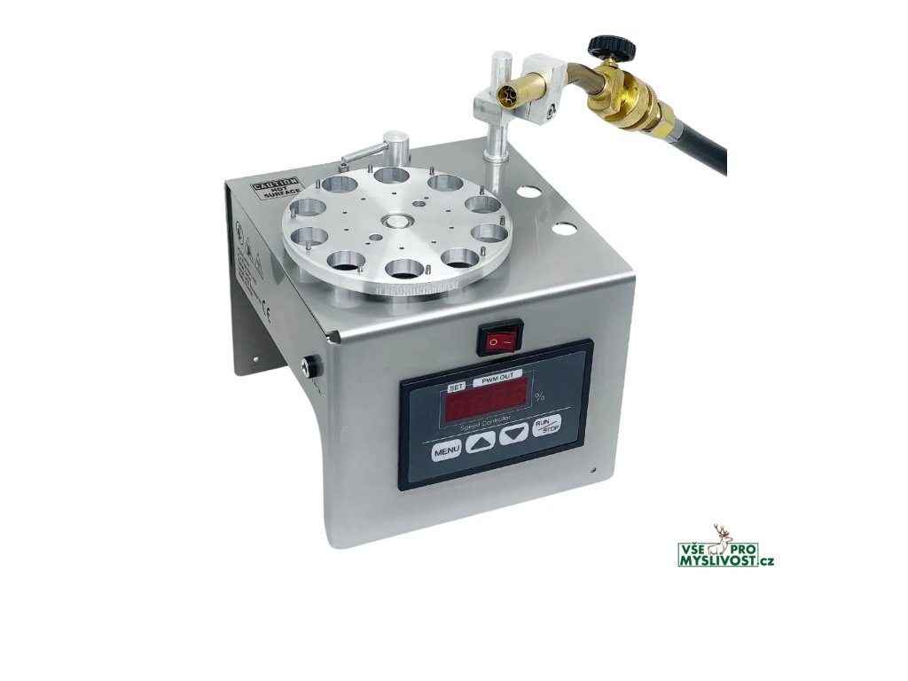 Nábojnice se otáčejí na ohřívací stanici s vlastním motorem, což zajišťuje rovnoměrné šíření tepla během žíhacího procesu.